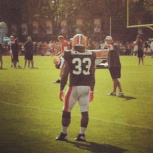 Brandon Weeden ran with the first team for the majority of the practice, and while I was sweating standing still on the sideline, he ran the 2 minute offense right in front of us on the far field. While I’m really just pretending to know what I’m looking at, the offense ran pretty crisply. Gordon botched a low throw from Weeden that should have been caught, and Jordan Cameron 1-upped him in that category with a simply hideous attempt at catching a ball that was right in his hands. Ok, so other than that, Weeden throws a noticeably crisper ball than Colt, and if he can grasp this offense quick and catch the ball for our recievers, we should be good there. Whew. Good deal.