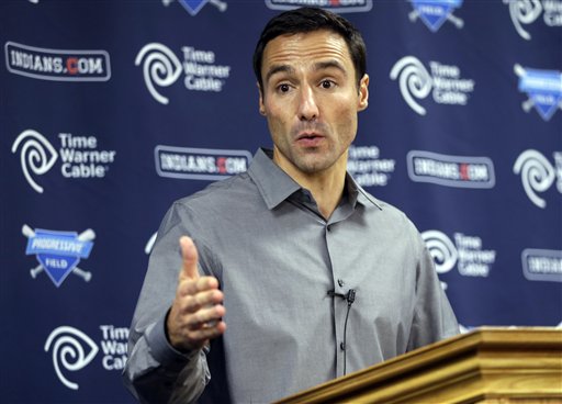 Cleveland Indians general manager Chris Antonetti speaks at a news conference announcing that manager Manny Acta was fired, Thursday, Sept. 27, 2012, in Cleveland. Bench coach Sandy Alomar, a former Indians All-star catcher and fan favorite who could become Cleveland’s next full-time manager, will replace Acta for the last six games of 2012. (AP Photo/Mark Duncan)
