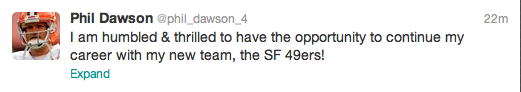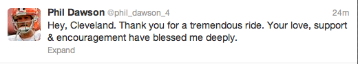 Perhaps the only situation that could possibly be worse for the collective psyche of Cleveland than Josh Cribbs’ departure is the departure of Phil Dawson. Tuesday, Phil Dawson had a few things to say on Twitter. You may want to make sure you’re sitting down and that you don’t have any sharp objects near you before you proceed. It went like this:
